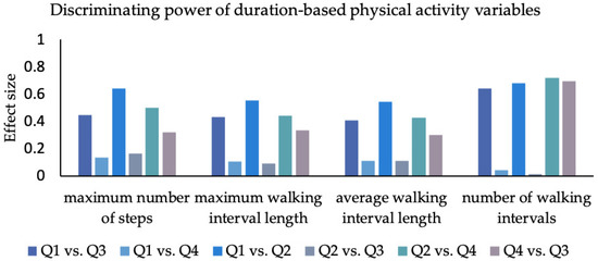 The effect size for each group comparison for duration-based PA variables. Q1: 1. quadrant (can do–do do), Q2: 2. quadrant (cannot do–do not do), Q3: 3. quadrant (can do–do not do), Q4: 4. quadrant (cannot do–do do); maximum continuous number of steps, maximum walking interval length (in s), average walking interval (in s), number of walking intervals.