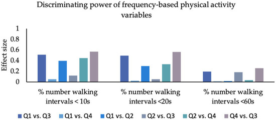 The effect size for each group comparison for frequency-based PA variables. Q1: 1. quadrant (can do–do do), Q2: 2. quadrant (cannot do–do not do), Q3: 3. quadrant (can do–do not do), Q4: 4. quadrant (cannot do–do do); percentage (%) number of walking intervals < 10 s, percentage (%) number of walking intervals length < 20 s, percentage number of walking intervals length < 60 s.