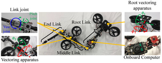 - We performed experiments with two different platforms, as shown in Figure 1, to demonstrate the feasibility of the proposed design, and modeling and control methods for the flight with joint motion in midair.