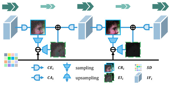 In other related methods, is normally compressed into one-channel by and sampled to achieve the error in the compressed domain, as shown in Figure 6. The residual error is upsampled into another error image with the same size as . Then, is added to the main branch directly. Following that, the one-channel feature is augmented in the channel dimension to generate for the next step. In such a way, most intermediate results will be lost during the forced compression, which is indicated by the lighter and smaller green arrows in Figure 6. This is a large bottleneck of the network performance.