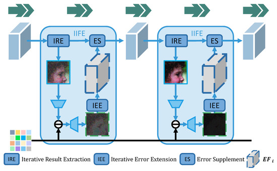 IIFE module. IRE, IEE, and ES modules, marked with dark blue boxes, aim to extract the from , encode and extend the to output abundant information of Error Features , and supplement the main branch by , respectively. Additionally, and are represented as blue and gray cubes, respectively. Compared with Figure 6, there is no forced waste and compression of the information flow marked by green arrows, thus achieving a smoother reconstruction.