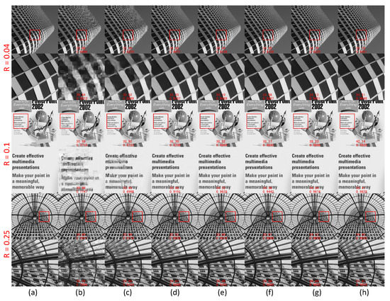 For the qualitative evaluation, the performances of different methods can be compared based on the visual perception of the final output images. In Figure 9, three result sets (, and ) are randomly selected to fully demonstrate the intuitive performance of reconstruction. The full images and the enlarged parts are displayed simultaneously to show the texture and edge more clearly. In addition, the and of the images and enlarged parts are both calculated and listed. The comparison shows that there are much fewer artifacts or blurred parts in the results from the proposed method in this work than that of the other counterparts. The comparison among different methods can fully prove that the proposed method shows greater advantages in processing texture details and high-quality images with vivid and sharp edges.