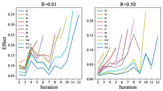 In addition, the average weights in the convolution layers of ECCE from different iterations are calculated to analyze the internal interpretability, as visualized in Figure 10. In the figure, the two sampling rates, and , are employed to show the internal interpretability. On the one hand, all polylines from different ratios are basically in an upwards trend. This is because the closer the iteration is, the more contributive it will be to the current iteration results. The in previous iterations will guide the inference of at this stage because their corresponding weights cannot be ignored by comparison. The network will be committed to recovering the problems not solved by previous iterations. However, the produced in the current iteration is decisive because the weight of this input channel is the largest.