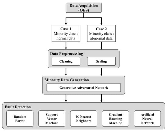 Machine learning algorithms have been applied to improve the fault detection performance in complex plasma processes using OES data [17,18]. Data in the semiconductor mass production environment, including OES data, are rarely labeled and contain extremely small fault data compared with the data from the normal process. They also suffer from data class imbalances [19,20]. Class imbalance causes the problem of insufficiently predicting a minority class by intensively learning a majority class in machine learning, and failure to classify a faulty wafer, which is mostly the minority class, leads to large production loss in wafer fabrication [21,22].