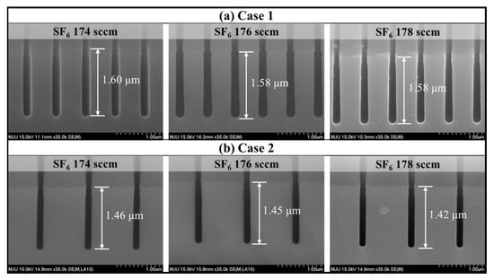 Cross-sectional SEM image of process results with the mis-calibrated MFC; (a) results with −5% calibrated MFC and (b) results with +5% calibrated MFC.