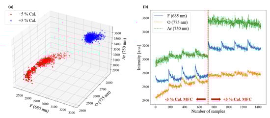 OES data of experiments for the mis-calibrated MFC; (a) 3D plot with each mis-calibrated MFC, and (b) variation of OES intensity.