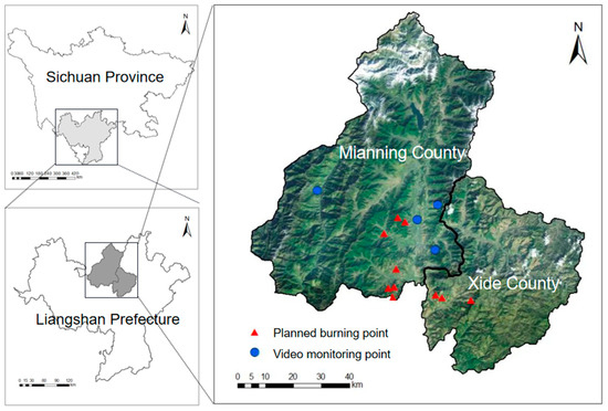 The study areas in this paper are Mianning County and Xide County, Liangshan Prefecture, Sichuan Province, China. Their geographical locations are shown in Figure 1. Mianning County and Xide County are located at the mountainous area in the southwest of Sichuan Basin, belonging to the subtropical monsoon climate zone. The average altitude of the whole region is over 1500 m. The solar radiation is high during the day and the temperature difference between day and night here is huge. Every year from January to June, with hot dry weather and little precipitation for a long time, forest fires are easier to occur. Mianning County and Xide County plan to start the planned burning in January 2022, allowing us to collect a lot of real and effective forest fire data in a month.