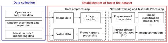 The specific process of data processing for the forest fire dataset is shown in Figure 2. Data collection in this study mainly includes open-source forest fire data, field experiment data, and forest fire video monitoring data provided by the local forestry and grass bureau. Establishment of the forest fire dataset mainly includes data preprocessing, network training, and test data processing; we will introduce the data processing procedure in detail.