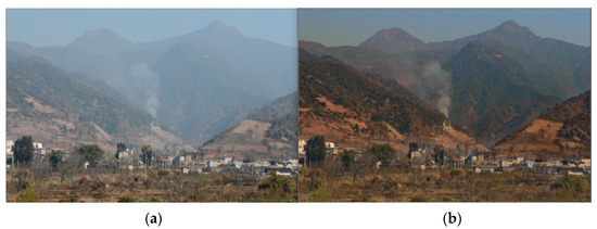 The detection of forest fire is easily disturbed by fog. The study area (see Section 2.1) in this paper is characterized by complex terrain and fog. In a foggy environment, the reflected light of the shooting target will be absorbed, refracted, and scattered by the suspended particles in the air, resulting in the attenuation of natural light. This may lead to the overall whiteness, contrast reduction, and the color deviation of the captured image [19]. Moreover, the targets may be covered by fog [20], which will result in poor detection performance. Smoke has similar physical characteristics to fog (both have a white color and foggy shape), which also results in reducing the accuracy of the forest fire detection. What is more, there are many people living in mountain forests of the study area; we can’t ignore the possibility of the main fire sources being caused by their productive and living activities [21].