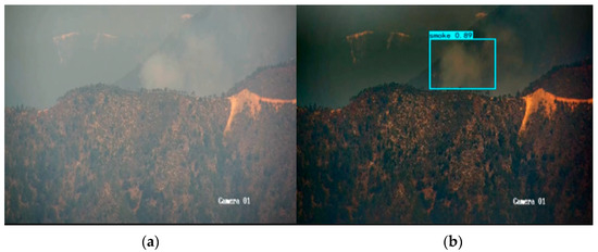 Comparison of forest fire detection result in foggy environment by (a) YOLOX-L-Light and (b) GLXD.