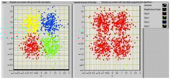 The use of clustering algorithms allows for the spatial distribution of characteristic vectors to be used as a basis for grouping input data. Each element connected with a set of data will be characterized by a vector whose components are represented by the representative qualities or attributes of the vector in order to examine the similarity or differences between them and to categorize them. The determination of the characteristic/attribute number and their definition requires a deeper analysis of the database designed on the available information and considering the expertise of specialists [38,39]. The vectors connected to the input data are grouped throughout the clustering phase based on the estimated distance between each of them. Depending on the analyzed topic, the clustering process will result in one or more clusters (groups, patterns, models, or classes), which describe the spatial position of the qualities taken into account for the process’ elements. Within each cluster, the elements are closer to a common center when compared to other centers belonging to other groups. This aspect is exemplified in Figure 1.