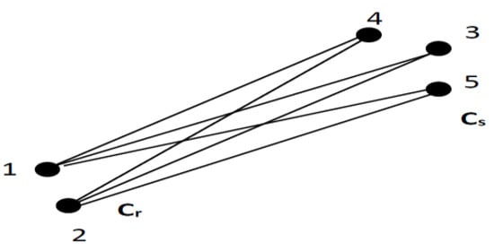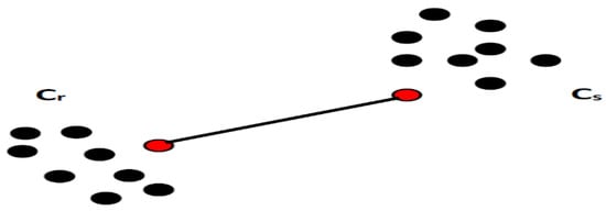 where the f component is attributed to the cluster and the element h to cluster . In this case, the distance is calculated between each possible pair of elements (f, h). The minimum value is the distance between the cluster’s and . In other words, the distance between two clusters is given by the shortest link value. At every stage of the clustering process, the and clusters, for which is minimal, will be coupled. A graphical interpretation of the minimum distance between the clusters is shown in Figure 4.