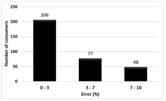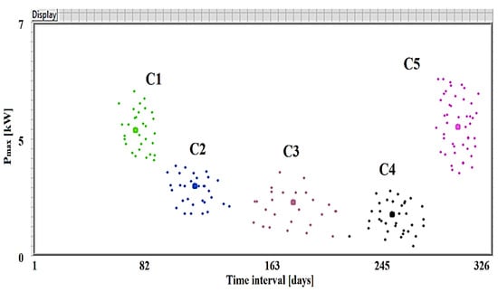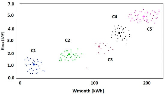 To evaluate the representative load profiles, the gravity center was applied, taking into consideration the scattering of the LV pilot located in a region from Romania [40]. Every load graph is set by 48 hourly values correlated with consumer behavior over one day. Missing load curves or abnormal values of zero throughout the day must be eliminated from the procedure, with only 144 consumers remaining eligible. The clustering procedure resulted in five consumption classes (clusters) (Table 3).