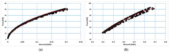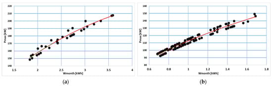 - After dividing the data into several clusters, the regression model based on first- and second-degree polynomials for every consumption class was applied, performing a predictive statistical analysis on the data to determine which buildings had a high, medium, and low level of energy consumption.