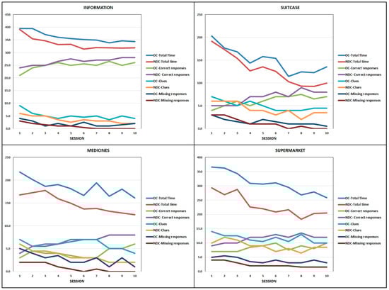 The comparisons between EG-DC and EG-NDC in the 1st, 5th, and 10th sessions of the VRT, carried out by means of the Mann–Whitney U test (Table 4), showed statistically significant differences in the correct responses for Suitcase in the 10th session, Medicines in the 5th session, and Supermarket in both the 5th and 10th sessions; in missing responses for Supermarket in the 5th session, Information in the 10th session, and in Medicine in the 1st session; and in numbers of clues for Medicine in the 5th session.