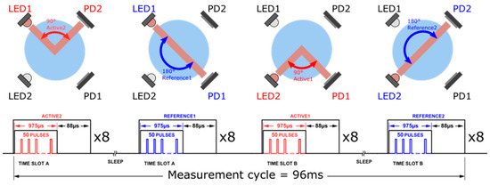 Measurement sequence implemented by the software to measure Active2, Reference1, Active1, and Reference2 signals and corresponding timing diagram illustrating the AFE operation. Each step was performed eight times to perform internal averaging, which allows to improve signal-to-noise ratio. Total measurement time in this configuration is 96 ms.