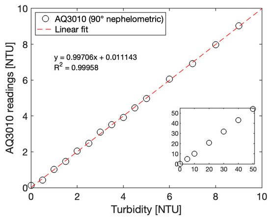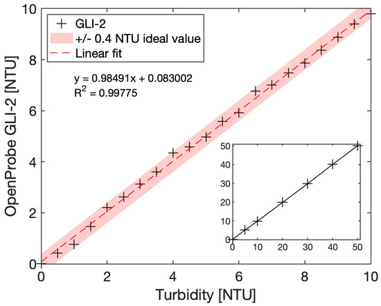 Calibrated OpenProbe GLI-2 sensor immersed in Formazin calibration solutions from 0 to 10 NTU (main graph) and 0 to 50 NTU (inset). A confidence interval of +/−0.4 NTU was obtained in the 0 to 10 NTU range.