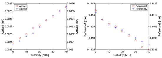 Briefly, a Keithley 2400 source meter was used to stimulate the LEDs with a constant current of 80 mA, while the photocurrent issued from the photodiodes was measured with a Keithley 2100 Multimeter set up as an ampere meter. The LEDs excitation current was only briefly maintained during the measurement to avoid detrimental heating effects. The two optical configurations required by the GLI-2 method, i.e., 90° nephelometric (referred also as active) and 180° attenuation (referred also as reference), were measured with this setup and shown in Figure 7 for turbidity solutions varying from 0 to 40 NTU. It can be noted that the photocurrents vary as expected: in 90° nephelometric configuration, an increase in turbidity results in an increase of light diffraction and, consequently, in an increase of the collected light by the active photodiode. In the attenuation configuration, an increase of turbidity leads to an increase of light scattering and absorption, which turns into a decrease of the collected light by the 180° photodiode. A linear relationship between photocurrent and turbidity was observed in all configurations.