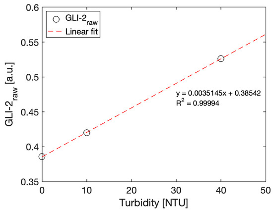 A three-point calibration was performed, as recommended by the U.S. Geological Survey for submersible turbidity sensors [35]. The sensor was immersed in three Formazin calibration solutions of 0, 10, and 40 NTU, while the ADC counts for Active1, Reference1, Active2, and Reference2 signals were recorded. The raw GLI-2 output was calculated according to Equation (1) and plotted Figure 9.