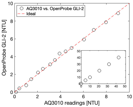 The data show that our sensor compares nicely even in the 0 to 10 NTU range despite an overall BoM cost of approximately USD 50 for a single prototype (excluding the Blue Robotics high-pressure enclosure, which could be replaced by a home-made PVC-based enclosure to keep the costs down), with an accuracy of +/−0.4 NTU or better in the 0 to 10 NTU range. While the commercial AQ3010 offers better accuracy, it is not capable of in situ measurement, as it requires manual water sampling, followed by pipetting of the sample into a clean vial, as well as a 20 s response time compared to the 100 ms response time of our OpenProbe GLI-2 sensor. In terms of cost, the Hydrolab 4-beam turbidity sensor, one of the very few commercial sensors capable of implementing the GLI-2 method in situ, costs several thousands of dollars.