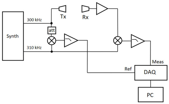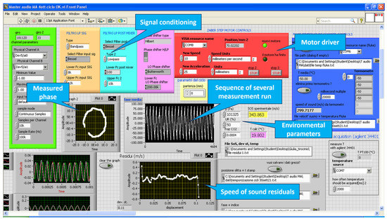A dual channel synthesizer generates two signals at 300 and 310 kHz, respectively. The first one is used to excite the Tx to generate the ultrasonic wave. The wave is collected by the Rx and converted into an electric signal that is amplified by a low noise amplifier. The second signal is used together with two mixers to lower the operating frequency down to 10 kHz. The RF port of the first mixer is fed with a portion of the signal at 300 kHz generated by the synthesizer. The RF port of the second mixer is fed with the signal coming from Rx. The LO port of both mixers is fed with the signal at 310 kHz. At the LF port of the mixers, a 10 kHz signal is generated, filtered by a 270 kHz RC low-pass filter, and finally sent to the acquisition system. The two signals are sampled by a 16-bit acquisition board (NI PCI-6132) and sent to LabView-based software (SW). Here, the signals are further filtered with band-pass filters (two-pole Bessel filter, 4 kHz wide) and sent to a phasemeter. The output of the phasemeter is low-pass filtered (two-pole Bessel filter at 100 Hz). The band-pass and the low-pass filters are used to reduce the noise present on the weak Rx signal and improve the performances of the phase measurement; indeed, the piezo transducers are designed to be used at much shorter distance (a few mm rather than 400 mm), so the received signal is in the sub-millivolt range. The filtered output of the phasemeter is eventually recorded at a rate of 10 points per second. At the same time, the SW manages the motor driver in order to move the carriage at a constant speed of 5 mm/s. Speed fluctuations are minimum because of the high resolution and mechanical quality of the translation stage. A single measurement run lasts 20 s: in this time interval, the carriage is moved from one end to the other and the phase is measured continuously. At the end of the movement, the measured phase is plotted versus the travelled path, showing a linear behaviour due to the constant movement of the carriage. Then, the slope of the phase vs. displacement is calculated. As shown in Equation (3), this number is inversely proportional to the speed of sound in air. Therefore, for each measurement run, we obtain a value of the speed of sound. From this and from the measured values of ambient pressure and relative humidity, by applying the Zuckerwar model, one value of air temperature is calculated and recorded for each ramp.