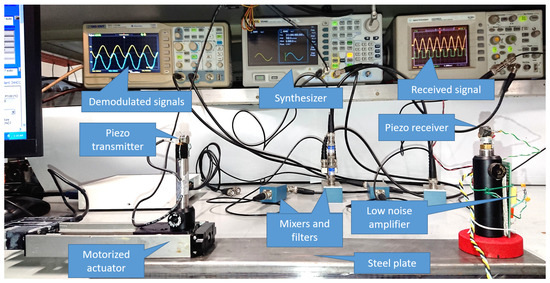 A simplified schematic of the CAT is presented in Figure 1. The instrument is based on two piezo transducers (model HT 300PLT from HTW, China) able to generate and receive acoustic waves at 300 kHz. The choice of the frequency was driven by the consideration that, for a given displacement L, the phase change is proportional to the frequency (see formulas (2) and (3)), so high frequencies are preferable for achieving higher resolution. On the other hand, high frequencies are strongly attenuated by relaxation effects (at 300 kHz the attenuation exceeds 1000 dB per 100 m [22]). Finally, it is not easy to find ultrasound generators off the shelf designed to operate in air above 300 kHz. One of the two piezo transducers (the transmitter, Tx) is mounted on a translation stage fixed to a steel plate, while the second one (the receiver Rx) is fixed to the same plate. The moving stage is made of a microstep motor coupled to a precision screw which moves a carriage with a resolution of 0.12 µm over 100 mm (Zaber X-LHM100A). The stage is fixed to the steel plate so that the movement of the carriage is parallel to the axis between the centres of the two piezo transducers. A laser pointer fixed next to Rx is used to align the system. The distance between Tx and Rx varies from 300 mm to 400 mm. In principle, the distance can be substantially reduced, leading to a more compact realization; nevertheless, in this phase, we decided to maintain a minimum distance between the two piezo transducers in order to be sure to avoid cavity effects. The movement of the carriage was calibrated with an interferometer (Renishaw XL-80) in order to correct for the errors in the relative position of the stage with respect to the receiver, with an uncertainty of a few micrometres. The stage movement and position depend on temperature; thus, to guarantee the uncertainty level, the temperature of the translation stage must be monitored.