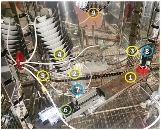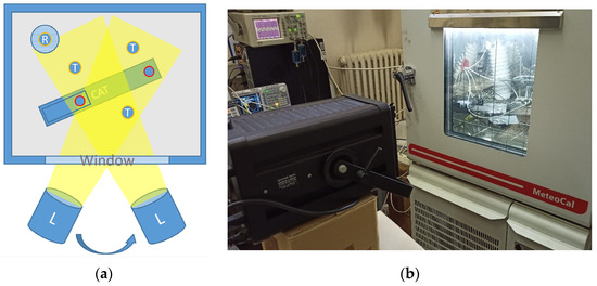 A second experiment was performed to demonstrate the immunity of the CAT to irradiation. The scheme of the setup and a picture are shown in Figure 7. A high-power halogen 1000 W projector was used to shine light through the glass of the chamber’s door. The whole CAT was illuminated, while the thermometers were illuminated in different ways depending on their position in the chamber. During the measurements, the chamber was kept at a constant temperature, and the light projector was switched on and off and moved in different positions.