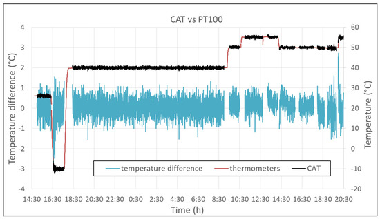 The experiment was carried out at the INRIM laboratory for “applied thermodynamics and thermal metrology for climate” during the summer of 2021. A Kambic 105 climatic chamber with an extended range option, able to cover the whole range of atmospheric temperature and humidity values, was used to test the CAT against 4 reference platinum resistance thermometers (Pt100) connected to a Fluke 1586A super-DAQ readout system. Three thermometers were used to measure the air temperature in proximity of the CAT measurement volume, and the fourth was used to record the temperature of the moving carriage. A picture of the experimental set-up is shown in Figure 5. Measurements were performed in a temperature range from −30 °C to +55 °C and relative humidity ranging from 10%rh to 90%rh. In all conditions, the measurement of the CAT and of the Pt100 thermometers were recorded for about 1 hour, meaning that hundreds of data points were gathered for each experimental condition. The average of three Pt100 thermometers was evaluated and considered as the reference temperature of the climatic chamber to be compared with temperature values measured by the CAT. A typical measurement series is shown in Figure 6.