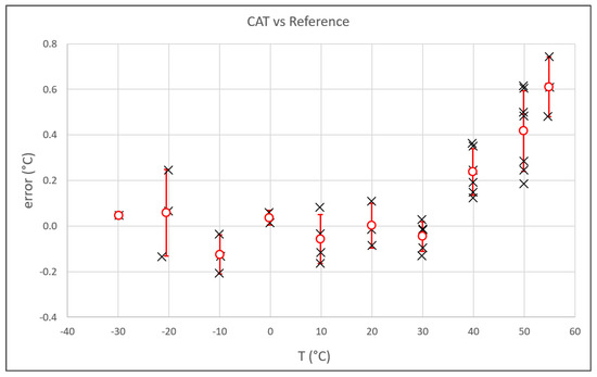 A summary of the results obtained in the experiment is presented in Figure 8 in terms of CAT errors, i.e., differences between the temperature measured by the CAT and the reference temperature, calculated as the average of the three platinum thermometers. The lowest temperature achieved was −30 °C, limited by the freezing of the lubricant of the motorized actuator screw. The highest temperature was chosen to include the higher values of air temperature recorded near Earth’s surface. The black crosses represent the CAT errors obtained by averaging measurements registered for about one hour at that specific environmental condition. The red circles represent the average errors calculated for each temperature represented by the black crosses. The vertical red bar is the standard deviation of the measurements. The agreement between CAT and the traditional platinum resistance thermometers was well within ± 0.2 °C in the range −30 °C to +30 °C. At higher temperatures, the agreement worsened, although this was limited to 0.6 °C. This tendency must be investigated.