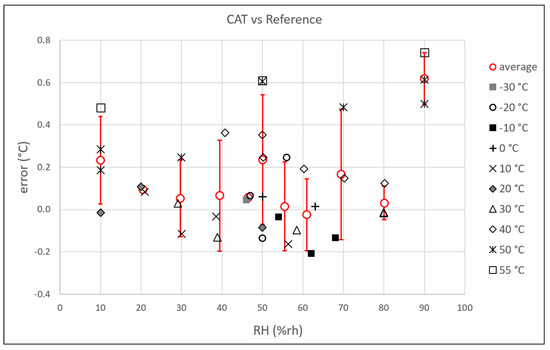 For each temperature, different values of RH were set in a range between 10%rh to 90%rh. In Figure 9, the distribution of the error of all the measurements with respect to RH is plotted in order to find a possible correlation between the two parameters. Although an excess error is observed at RH = 90%rh, a correlation was not observed, showing the independence of the CAT from RH.