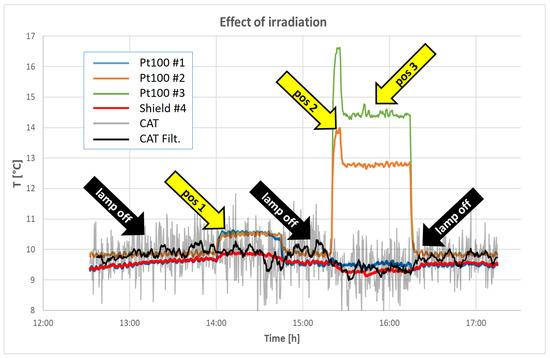 In Figure 10, a typical result of the experiment implemented to demonstrate the difference between classical contact thermometry and acoustic thermometry in their dependence on irradiation is reported. In a single run of about five hours, four different irradiation conditions were generated. One was close to zero irradiation (the condition of all the measurements described so far); the others were generated by positioning the light projector in three different positions (distance and angle) in order to expose the three Pt100s and the CAT to different illumination conditions. It is evident that the heating of the Pt100s directly depends on the strength of the light, while, as expected, the CAT is immune to it. A thermometer in a solar shield was used as a reference for comparison (see picture in Figure 5).