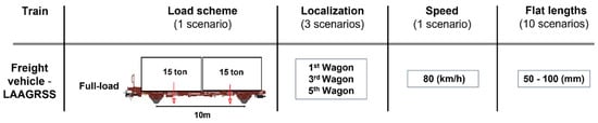 Figure 3 presents the baseline scenario for which 113 simulations were performed considering a freight train comprising five wagons. Six different types of loading schemes were considered: (i) full-loaded train; (ii) half-loaded train, (iii) empty train, as well as trains with unbalanced loads in the transversal and longitudinal directions, namely (iv) UNB1, (v) UNB2 and (vi) UNB3. According to UIC loading guidelines [] different unbalanced loading schemes were defined for the wagon model, where the cargo gravity center was offset in longitudinal and transversal directions.