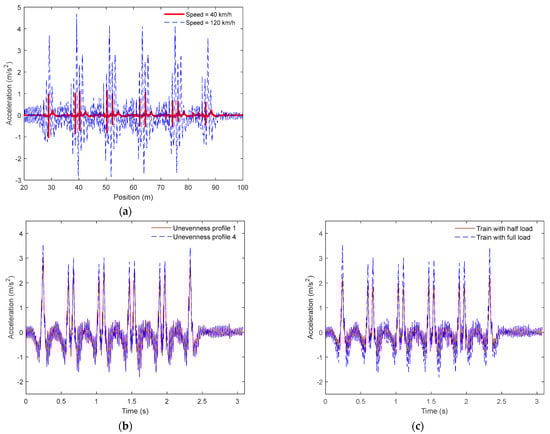 Acceleration time series for sensor 3 for a freight train considering a healthy wheel (baseline scenario): (a) influence of vehicle speed, (b) influence of the unevenness profile, (c) influence of the loading schemes.