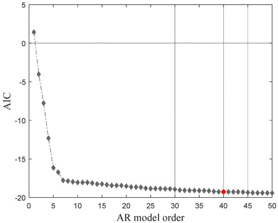 Several AR models were analyzed to determine the appropriate model order based on the Akaike information criteria (AIC), particularly the orders between 1 and 50. The AIC function for 30 damaged scenarios is shown in Figure 7. It can be concluded that, as the model’s order increases, the AIC values tend to stabilize, which demonstrates that after a model order of 40, higher orders do not yield relevant information.