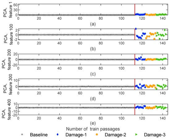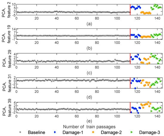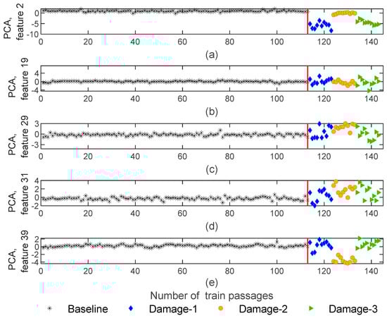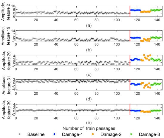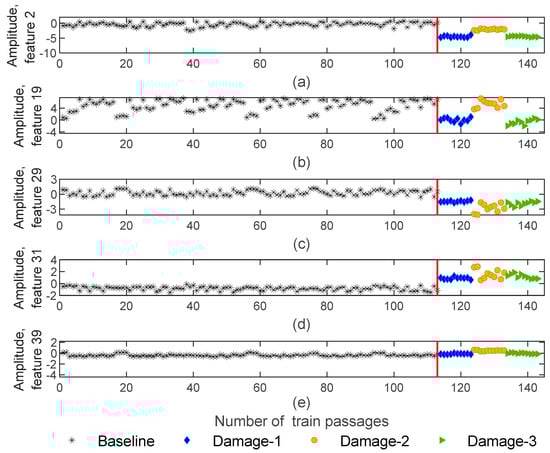 By implementing the PCA method to AR parameters to normalize the features, for each train passage, a 4−by−40 matrix with PCA-based features was generated. Figure 12 represents 5 features out of 40 for all the 143 baseline and damage scenarios using the AR model. As shown in Figure 12a,d, after removing EOVs, features remain sensitive to damage and significant variations in amplitude can occur between the baseline and damage scenarios. Additionally, it is noteworthy that, after normalization, the extracted features by using the AR model remain sensitive to the side where the wheel defect occurs. As an example, in Figure 12a,e, the variation in amplitude for the 1st and 5th wagons (blue and green colors) are differentiable from the 3rd wagon (orange color).