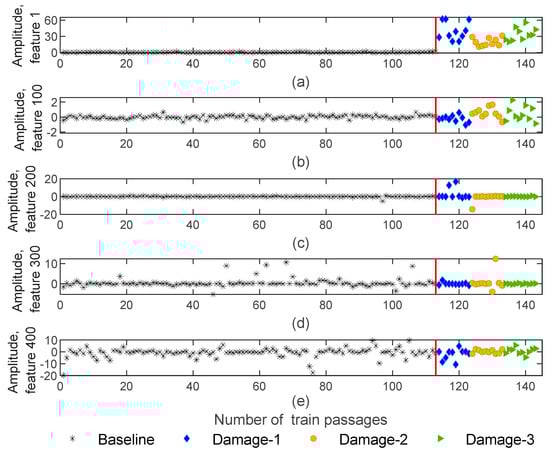 CWT—feature extraction for all 143 baseline and damage scenarios for accelerometer 3: (a) amplitude for feature 1, (b) amplitude for feature 100, (c) amplitude for feature 200, (d) amplitude for feature 300, (e) amplitude for feature 400.