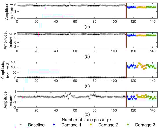 PCA—feature extraction for all 143 baseline and damage scenarios for accelerometer 3: (a) amplitude for feature 1, (b) amplitude for feature 2, (c) amplitude for feature 3, (d) amplitude for feature 4.