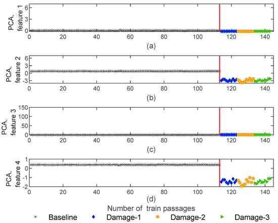 Data science frequently uses principal component analysis (PCA) to extract features based on the data projection into a new dimensionless subspace. PCA identifies the covariance matrix eigenvectors with the highest values [,,,]. In other words, the PCA method minimizes the number of features that effectively can capture the most significant of the original features. Thus, the number of extracted features is reduced to four and the matrices of damaged features are generated with 143−by−4−by−4 dimensions. The extracted features using PCA are represented in Figure 11. As shown, for features one and two, the dispersion of amplitude for healthy and defective wheels is almost imperceptible (Figure 11a,b). In turn, as Figure 11c shows for feature three, the amplitude variation of damaged scenarios is higher than baseline scenarios, and the amplitude difference between the damaged and healthy wheels is quite visible. This proves that only specific features have the potential to identify the damage.