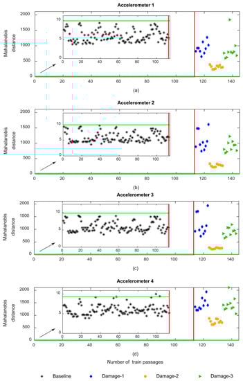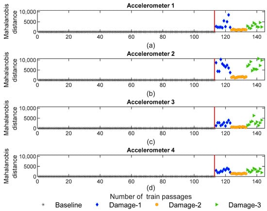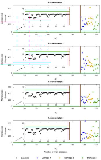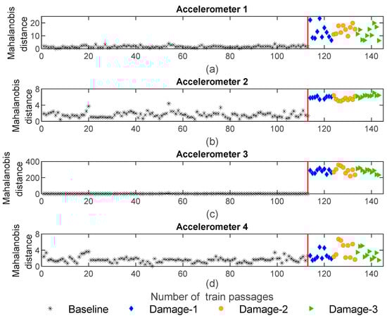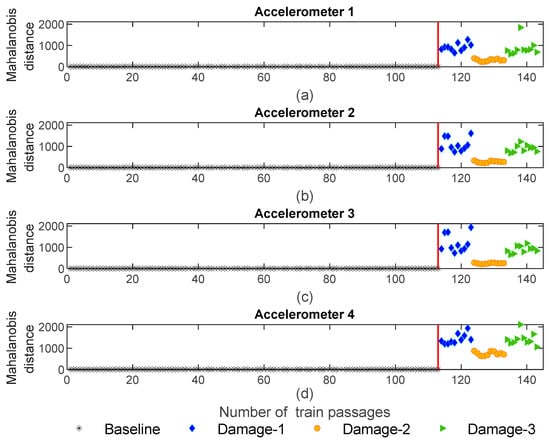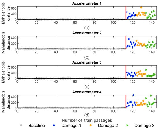 PCA—data fusion for all 143 baseline and damage scenarios: (a) MD for accelerometer 1, (b) MD for accelerometer 2, (c) MD for accelerometer 3, (d) MD for accelerometer 4.