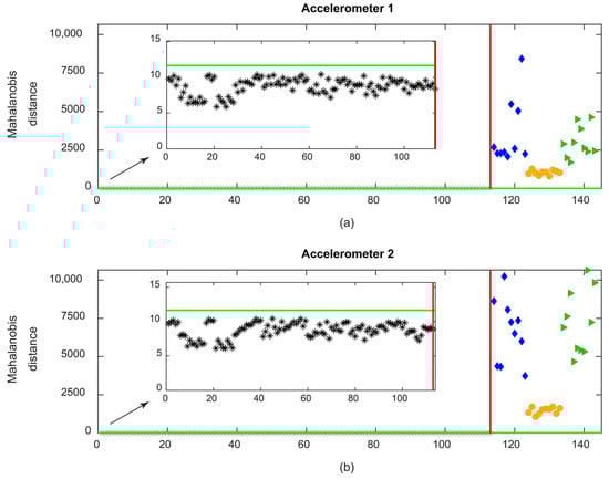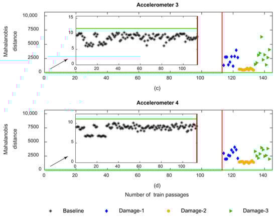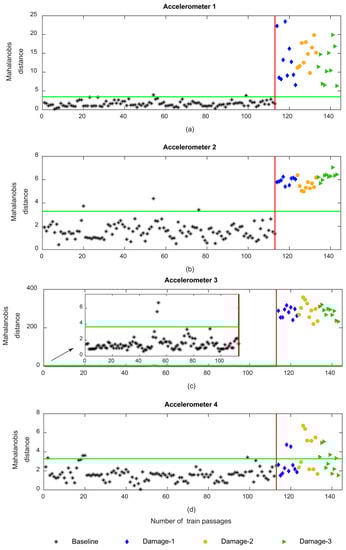 Figure 20 depicts the results of the automatic damage detection system that considers the responses from accelerometers 1–4 using the AR model. This figure indicates that damage detection can be effectively performed using only sensors installed on the rail (between or above sleepers). As an example, according to Figure 20a–c, the damaged wheels are efficiently detected without the occurrence of false-positive cases, and so the healthy wheels can be robustly separated from damage scenarios. Moreover, the distance between the damaged wheels and the CB is sufficiently high; however, for the baseline scenarios this distance is sometimes very close to the CB. On the other hand, in the case of sensor 4 (Figure 20d), located on the sleeper, the damage detection implies some false-positive cases, which means that damage detection is not accurate enough based on the data exclusively derived from accelerometers on the sleeper. Furthermore, by using the AR-derived features, it is possible to observe a distinction between the behavior of indicators from wheel flats on the right and left sides. It is relevant to mention that only one sensor is adequate to detect a defective wheel using the AR-derived features.