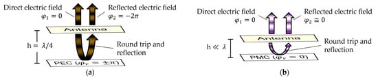 One way to obtain a unidirectional, high-gain radiation pattern with planar antennas is to add a parallel surface made of a good electrical conductor that can be considered to be a perfect electric conductor (PEC). The PEC reflector ensures most of the radiation towards a single hemisphere and avoids most of the radiation from the other hemisphere, providing thereby a low front-to-back ratio. Such a reflector maximizes the gain in the broadside direction if it is placed at ( is the wavelength) from the radiating element, thus causing the phase difference between the reflected and direct electric fields to equal in the broadside direction, as depicted in Figure 1a. Yet, the condition , where , is sufficient to enhance the broadside gain [4]. The phase difference accounts for the reflection coefficient phase of the surface and the path phase delay , related to the round trip between the radiating element and the reflector, where is the wavenumber. However, depends on the frequency and imposes bandwidth limitations.