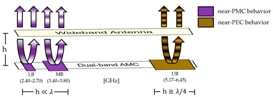 This dual-band AMC should emulate the PMC behavior at two specific frequencies close to each other and a near-PEC behavior far from resonances. When the AMC and the radiating element are spaced by a quarter-wavelength distance in the highest band, which implies a distance much smaller than a wavelength for the two lowest bands, it is possible to achieve a stable, unidirectional, high-gain pattern in a triple-band operation with wide bandwidths. Figure 2 depicts this principle considering the bands LB, MB, and UB.