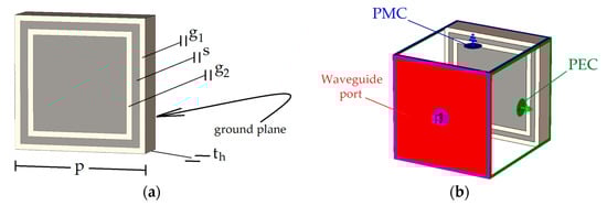- Based on [32], start with a unit cell with a periodicity , gaps and , and strip width , where is the wavelength at the frequency of the first resonance (as in [32], use a material with substrate thickness , relative permittivity , and dissipation factor );
