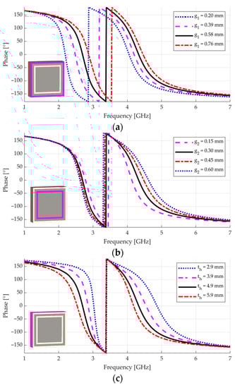 To obtain further insight about the operation of the double-square unit cell, a parametric study was performed with the transient solver of CST Studio Suite, with a waveguide port and proper PEC and PMC boundary conditions to emulate an infinite array, as illustrated in Figure 3b. In this configuration, a transverse electromagnetic (TEM) wave illuminates the surface at normal incidence [33]. The black lines in Figure 4 show the reflection coefficient phase considering the parameters in Table 1.
