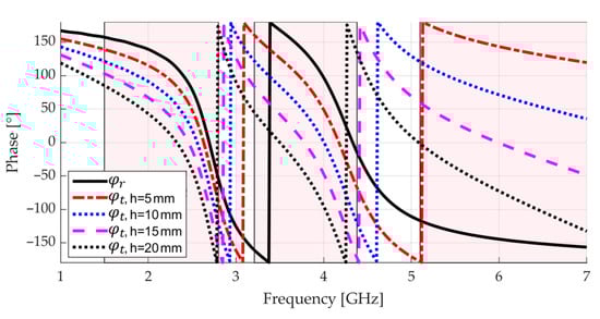 Following this methodology, the unit cell defined in Table 1 was designed. The black line in Figure 5 shows the reflection phase of this unit cell, which actually does not reach −180° in the UB. Figure 5 also shows the phase differences between the reflected and direct electric fields obtained in a plane placed at different distances from the unit cell. These curves are obtained by adjusting in CST Studio Suite the reference plane of the waveguide port represented in Figure 3b. In the final design, the condition found in [4] is used to define the distance between the antenna and the reflector plane. We see in Figure 5 that for the areas where (highlighted) encompass the bands LB, MB, and UB. This distance is around , where is the wavelength at the UB center frequency (5.81 GHz). Changing affects the path phase delay and ultimately shifts in frequency the regions where the phase difference meets the condition .