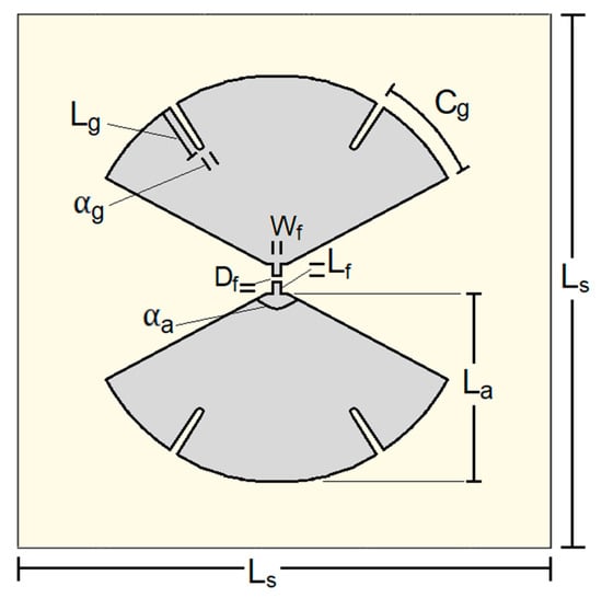 Aiming at showing that the presented methodology can work with simple shapes, a bow-tie was used as the radiating element due to its simple planar shape and well-known behavior. Despite its wideband input-impedance behavior, the conventional, triangular bow-tie shape presents pattern instabilities that make energy deviate from the broadside direction at some frequencies [34]. Hence, aiming to enhance the radiation stability towards each broadside direction in the operating frequency bands (in agreement with the only constraint related to the radiating element in the present methodology; see Section 2.1), a rounded-edge bow-tie shape was adopted in which four radially aligned grooves are inserted. A detailed study on a grooved bow-tie without the presence of a reflector, including the radiation patterns and the currents over the antenna, is presented in [35]. Without the reflector, an optimal input impedance is found. The introduction of a reflector, however, will change the input impedance, as expected. It is well-known in the literature that the bow-tie flare angle has a direct influence on the input impedance [36]. Hence, the antenna of [35] was adjusted, assuming the aspect of Figure 6.
