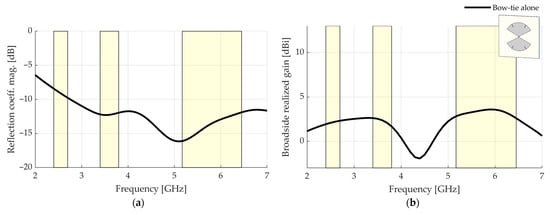 Simulated results for the standalone antenna (without any reflector): (a) reflection coefficient magnitude; (b) broadside realized gain. The bands of interest are highlighted.