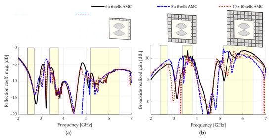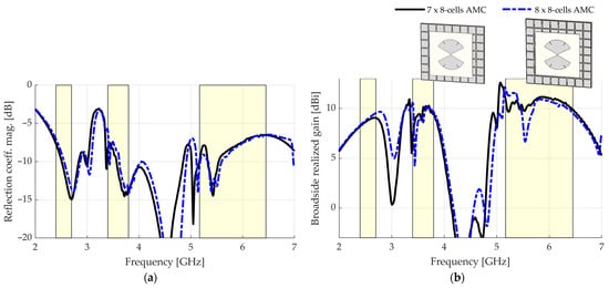 In the reflection coefficient magnitude of Figure 10a, no useful information about the band UB is obtained but it is visible that the drop in the reflection coefficient magnitude at 3.44 GHz shifted downward out of the MB band. In the broadside realized gain of Figure 10b, the drop in gain at 5.54 GHz, directly addressed in this attempt, is considerably softened from 6.7 to 9.8 dBi, from the version with the 8 × 8-cell AMC to that with the 7 × 8-cell AMC. Additionally, the drop in gain at 3.44 GHz, similar to the reflection coefficient magnitude, shifted downward out of the MB band. As such, all the LB, MB, and UB bands are covered with a good gain level.