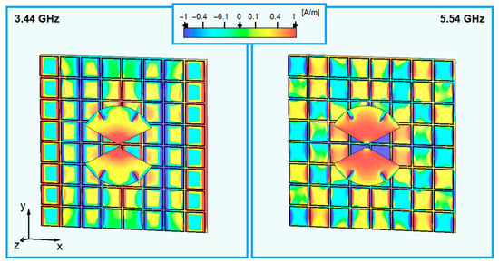Magnitude of the -component currents at 3.44 and 5.54 GHz on the 8 × 8-cell AMC.