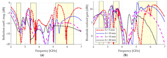 Before inserting a balun and foam bricks for mechanical support so as to fabricate the device, we were interested in observing how the performance changed with the spacing between the AMC and the bow-tie. Figure 11 shows the reflection coefficient magnitude and the broadside realized gain when the spacing varies from 5 to 20 mm. For reference, the curve styles used here match those of Figure 5 for respective values of . We can see in Figure 11a that the reflection coefficient magnitude is highly sensitive to changes in the spacing in all the addressed bands. This behavior is expected since the interferences of the fields around the bow-tie input terminals change according to , presenting an impact on the input impedance of the device. Figure 11b shows that, as the separation between the bow-tie and the AMC increases, the frequency ranges in which the broadside realized gain is maximum are shifted downward. This behavior is consistent with that seen in Figure 5, where the regions in which the phase difference respects the condition shift downward in frequency when increases. Specifically, the value of the spacing between the AMC and the bow-tie that covers all the LB, MB, and UB bands with a good broadside gain is , which coincides with the value in Figure 5 that respects the condition for all the bands.